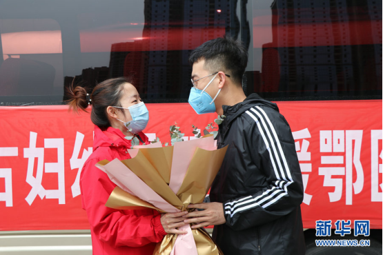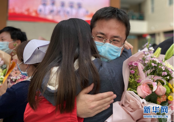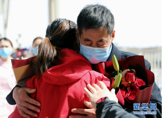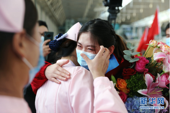 4月1日,呼和浩特市婦幼保健院外科護(hù)士郭佳靈與闊別已久的同事親切相擁。(新華網(wǎng) 李倩攝)