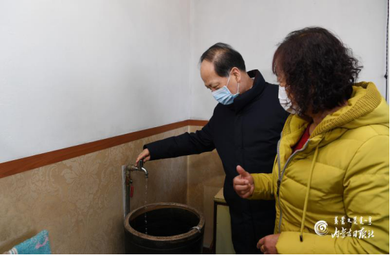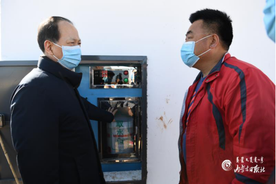 石泰峰十分關心群眾的飲水安全,每到一村、每進一戶都察看用水情況,詢問水質(zhì)達不達標、凈水器好不好用、供水量能不能保證。在大黑河鄉(xiāng)四十頃地村張占娃家,得知吃水要去集中供水點劃卡打水,石泰峰隨后就來到那里查看了解凈水設備運行和水質(zhì)、水量、水價等情況。他強調(diào),飲水安全事關群眾身體健康,要加強對群眾的宣傳引導,把每個環(huán)節(jié)的工作都做扎實、抓到位,確保群眾飲水安全有保障、可持續(xù)。