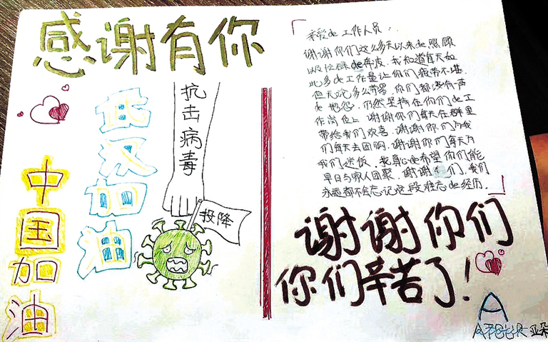 臨走時(shí),小涵留下一封感謝信,上面用彩筆寫(xiě)著“感謝有你”“中國(guó)加油”“武漢加油”,下面還畫(huà)了一幅病毒投降的圖畫(huà)。她在信中說(shuō):“謝謝你們這么多天以來(lái)的照顧以及奔波,我知道每天如此多的工作量讓你們疲勞不堪,但無(wú)論多么勞累,你們都沒(méi)有一聲抱怨,仍然堅(jiān)持在自己的工作崗位上。謝謝你們每天在群里帶給我們歡喜,謝謝你們每天為我們送飯。我真心希望你們能與家人團(tuán)聚,謝謝你們,我永遠(yuǎn)都不會(huì)忘記這段難忘的經(jīng)歷?!保ㄎ摹z影/北方新報(bào)正北方網(wǎng)記者張巧珍)