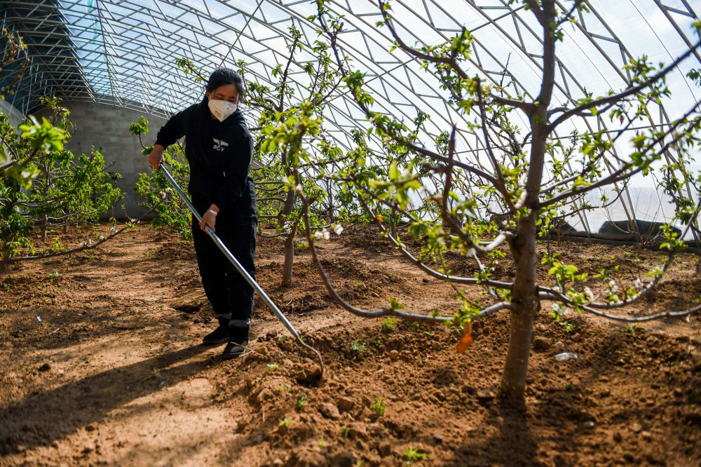 貧困戶王翠蓮在櫻桃大棚內(nèi)工作。新華社記者連振 攝