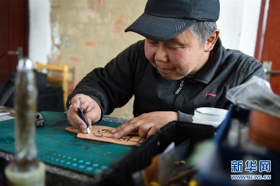 內(nèi)蒙古鄂溫克族自治旗錫尼河鎮(zhèn)村民米格木爾在制作皮雕(2020年4月15日攝)。新華社記者 劉磊 攝