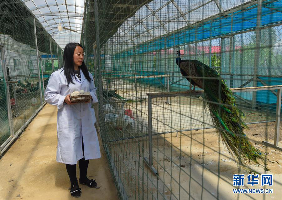 周海南在內(nèi)蒙古興安盟烏蘭浩特市義勒力特鎮(zhèn)蒙雀養(yǎng)殖專業(yè)合作社照料孔雀。養(yǎng)殖孔雀帶動(dòng)貧困戶脫貧致富(2018年5月21日攝)。新華社記者 彭源 攝