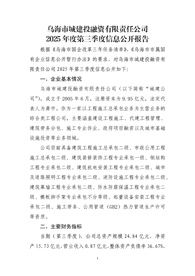 - 2025-04-22烏海市城建投融資有限責(zé)任公司2025年度第一季度信息公開(kāi)