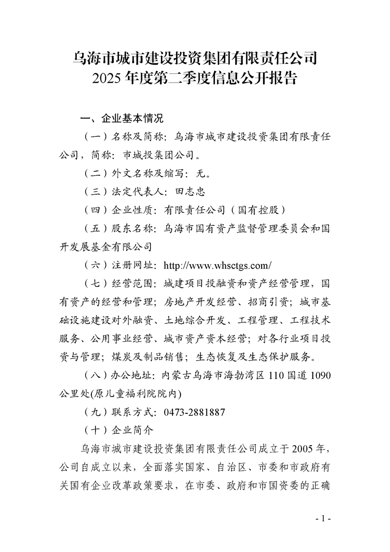 - 2025-04-23烏海市城市建設投資集團有限責任公司 2025年度第一季度信息公開報告