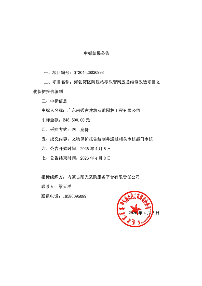 - 2026-04-23烏海市熱力有限責(zé)任公司第三方律所咨詢服務(wù)成交結(jié)果公告