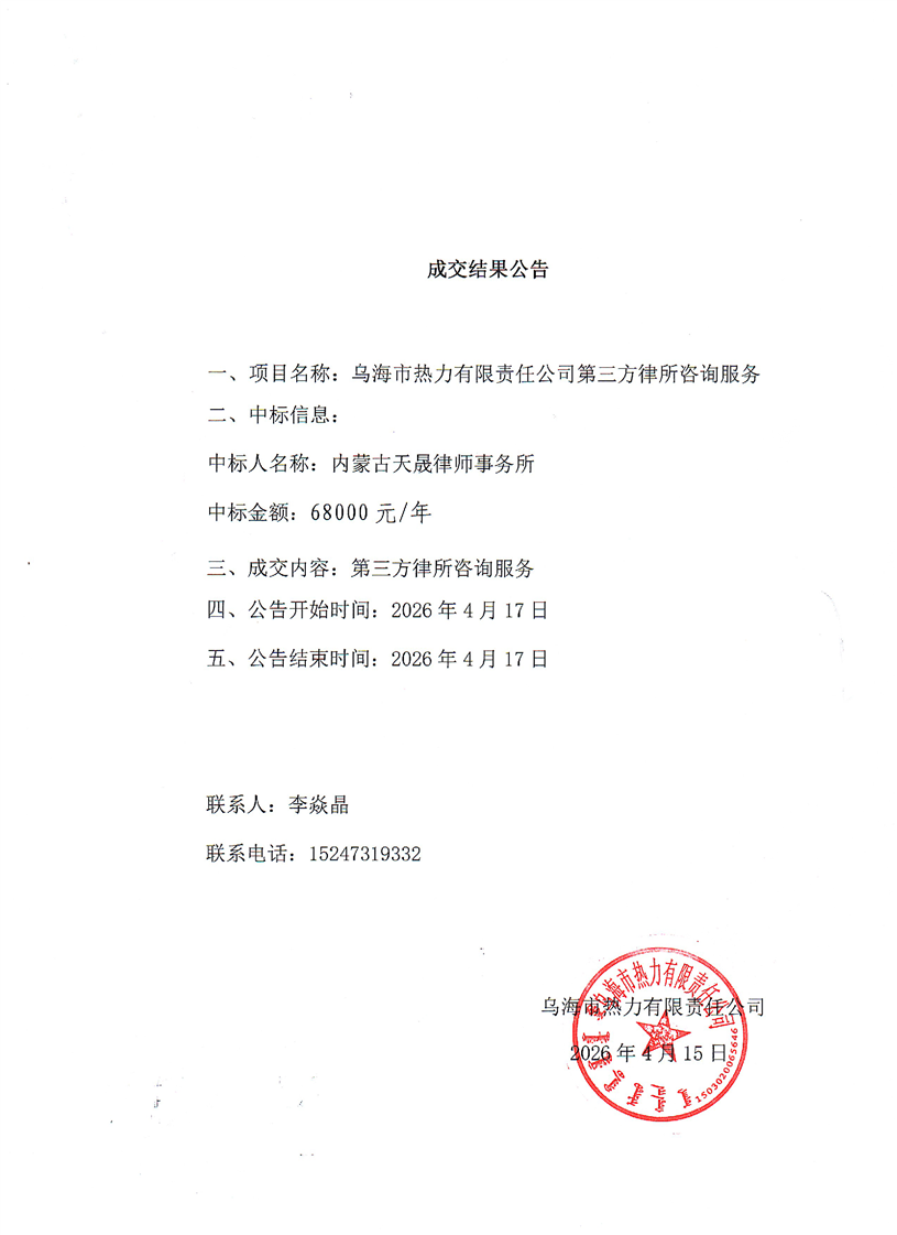 - 2026-04-23烏海市熱力有限責(zé)任公司第三方律所咨詢服務(wù)成交結(jié)果公告